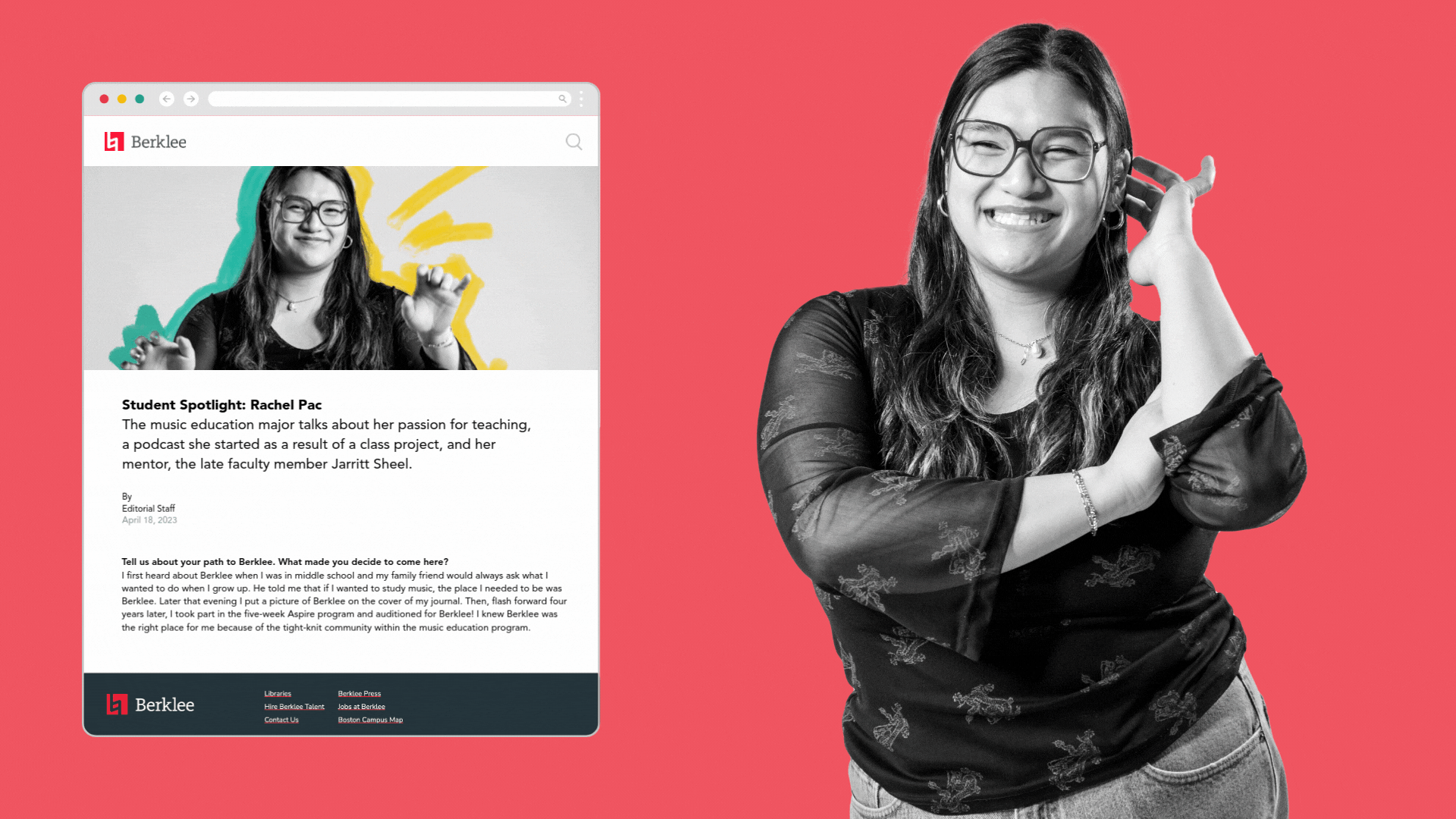 In 2023, I led the concepting and design for Berklee College of Music’s enrollment marketing campaign, “Spotlight,” featuring video and animation of real students telling their Berklee stories. I directed video producers, photographers, and animators from pre-production planning to post-production supervision and final delivery of on-brand digital and social content. Hand-drawn graphics accompanied visually arresting black and white photography and video. Photos by Kelly Davidson.